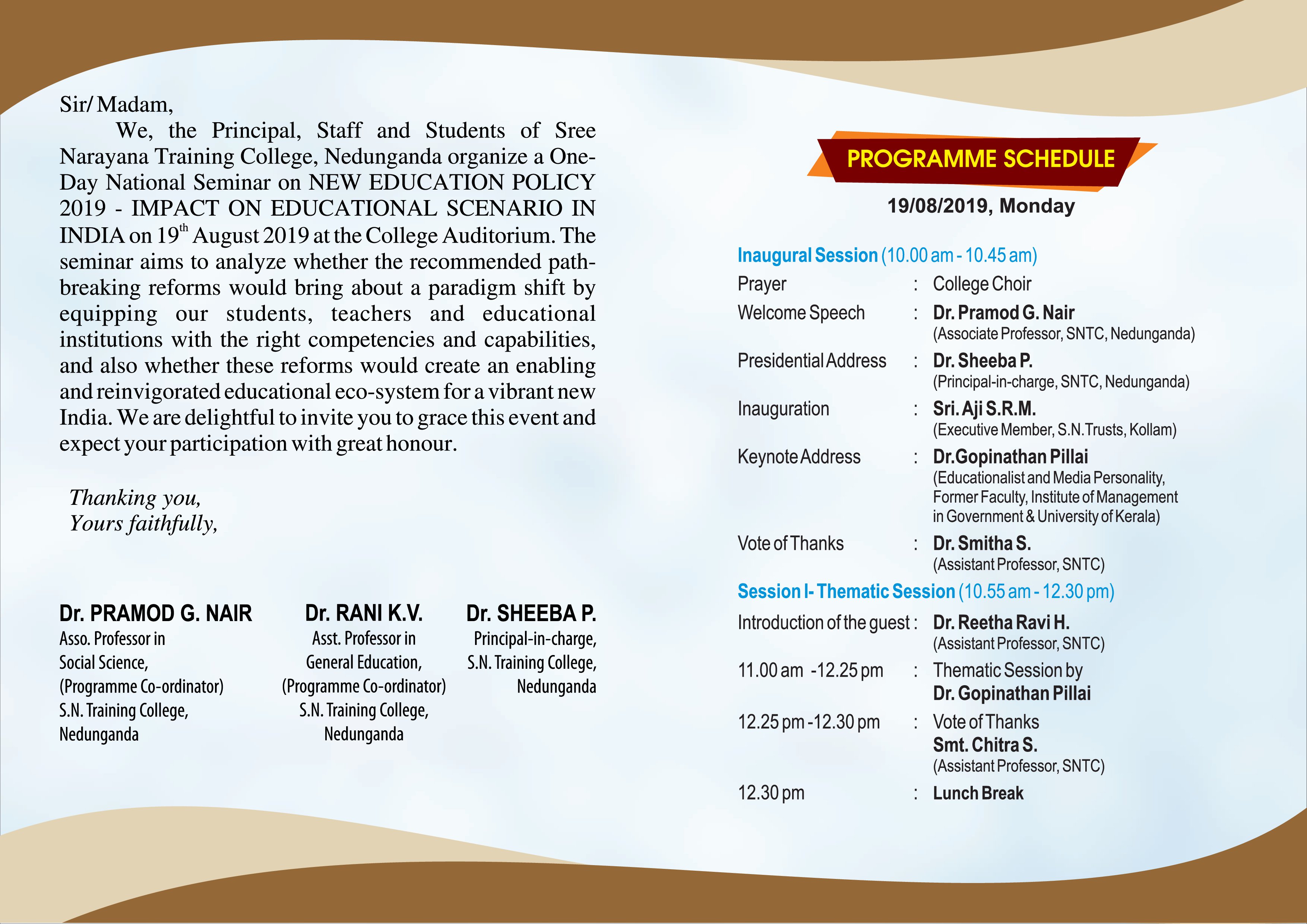 The seminar is scheduled on 19th August,2019. The programme will be inaugurated by Sri.Aji SRM, executive member S.N Trusts. Dr.Gopinathan Pillai, former faculty Institute of Management Kerala University and Dr. R.Mukundan, former principal NVKSD college of Education Attoor will deliver the resource talks