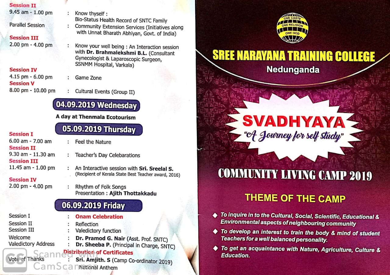 Svadhyaya 2019, the community living camp is scheduled from 2nd to 6th September. Sri M.Sreekumar, Circle Inspector, Kadakkavur will inaugurate the camp.