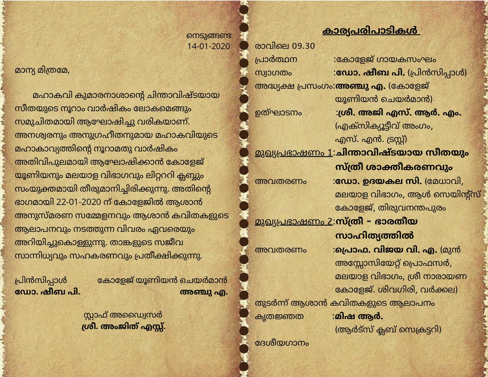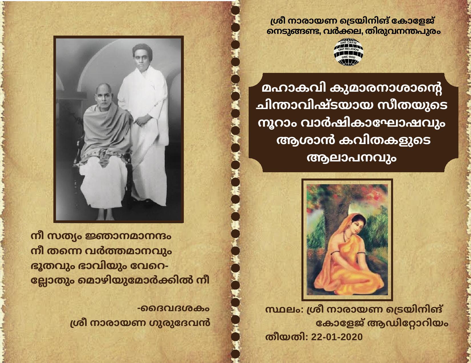 The Centenary celebrations of the poem written by Great poet Kumaranasan is scheduled on 22nd January 2020. Dr.Udayakala C., HOD All Saints college and Prof.Vijaya V.A., former faculty of S.N.Trust college Varkala will deliver the keynote addresses.