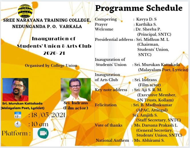 The inauguration of college Union 2021 is scheduled to 18th May 2021. Sri. Murukan Kattakada and Sri. Indians will inaugurated the college Union and arts club respectively.
