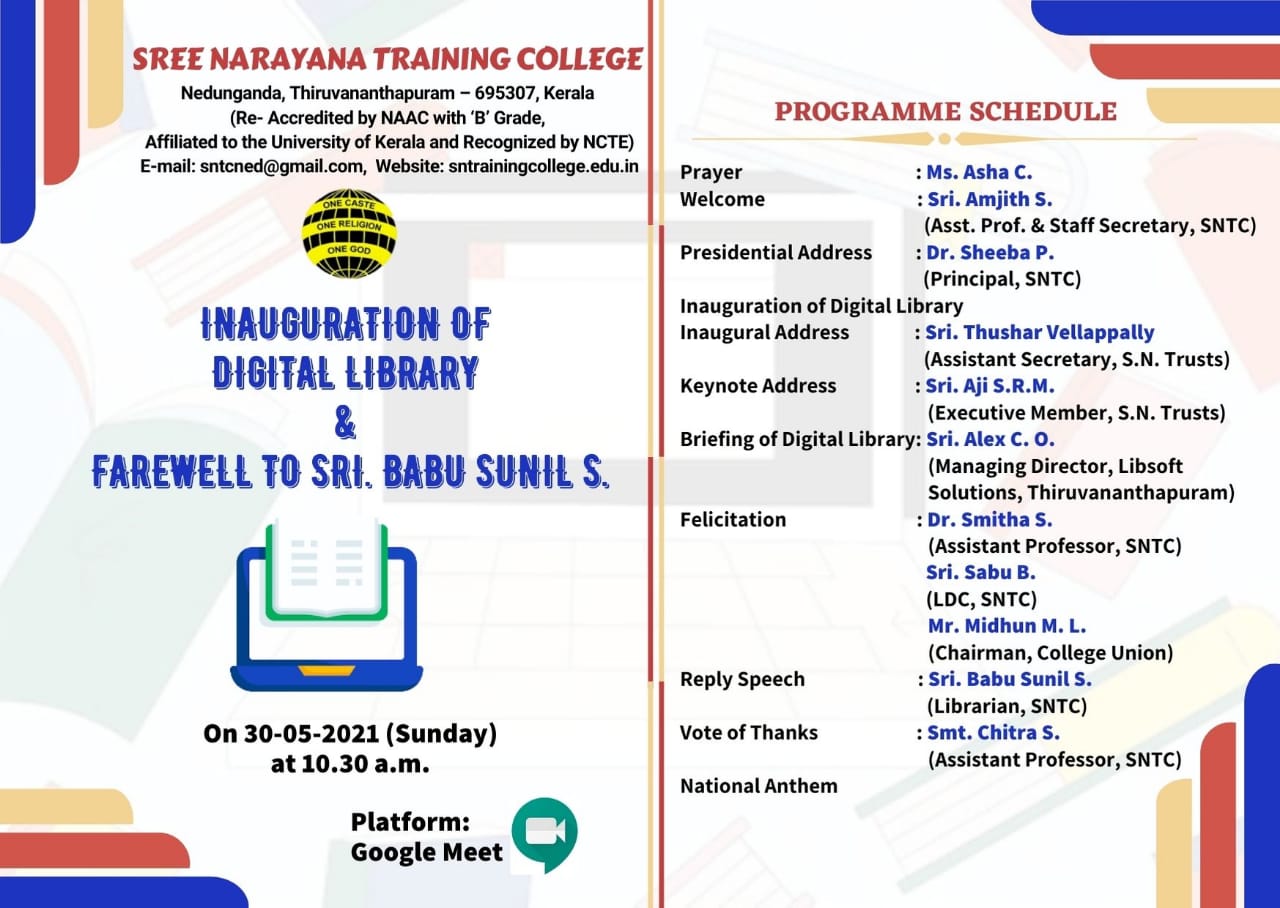 Inauguration of Digital library and Farewell to Sri. Babu Sunil S. is scheduled on 30/5/2021. Sri. Thushar Vellappally, Assistant Secretary, S.N. Trusts, Kollam will inaugurate the function. Sri. Aji S.R.M, Executive Member, S.N. Trusts will deliver the key note address.