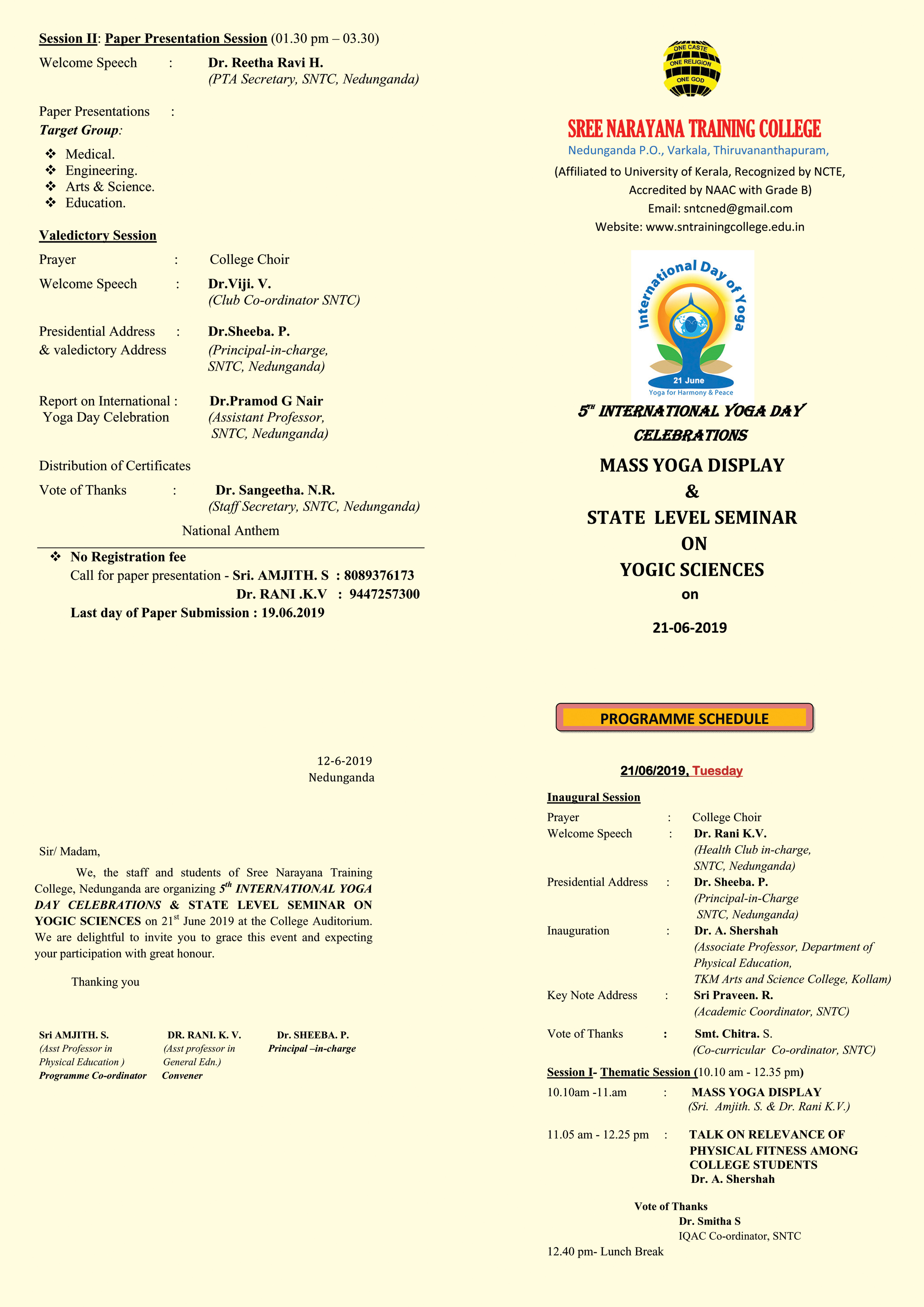 5th International Yoga Day celebration is scheduled on 21st June 2019. Dr.A.Shershah, Associate Professor ,Department of Physical Education , TKM Arts and Science College will inaugurate the function.