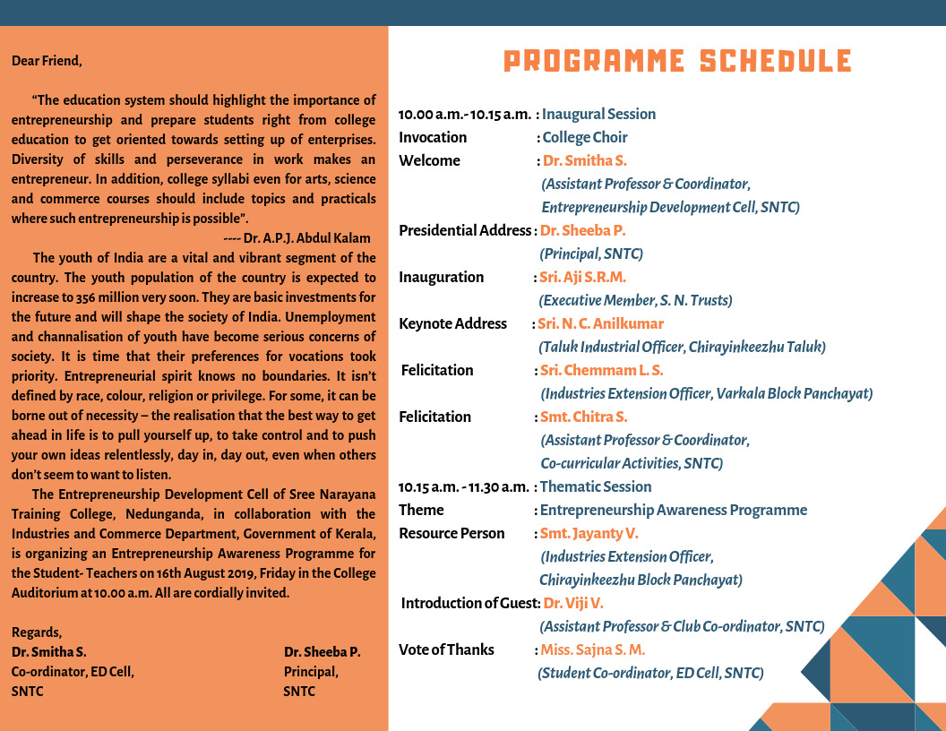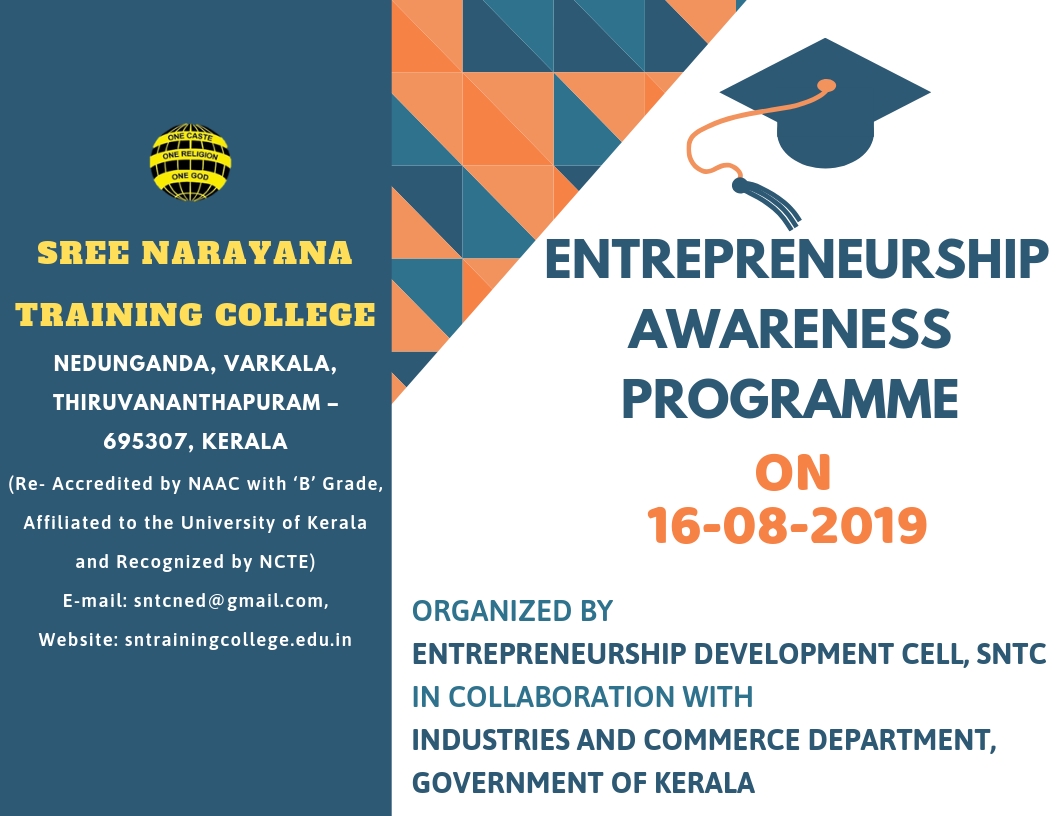 The programme is organized by Entrepreneurship Development cell, SNTC in collaboration with Industries and Commerce Department Government of Kerala.