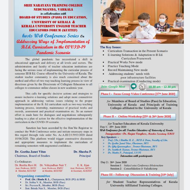 The Web Conference series organized by Sree Narayana Training College in collaboration with the Board of Studies (PASS) in Education, University of Kerala, and Kerala University English Teacher Educators Forum (KUETEF) is scheduled as three phases on 17th June 2020, 25th and 26th June 2020 and 10th July 2020. The Web Conference Series will be inaugurated by Dr. Rajan Varghese, Member, Secretary, Kerala Higher Education Council.